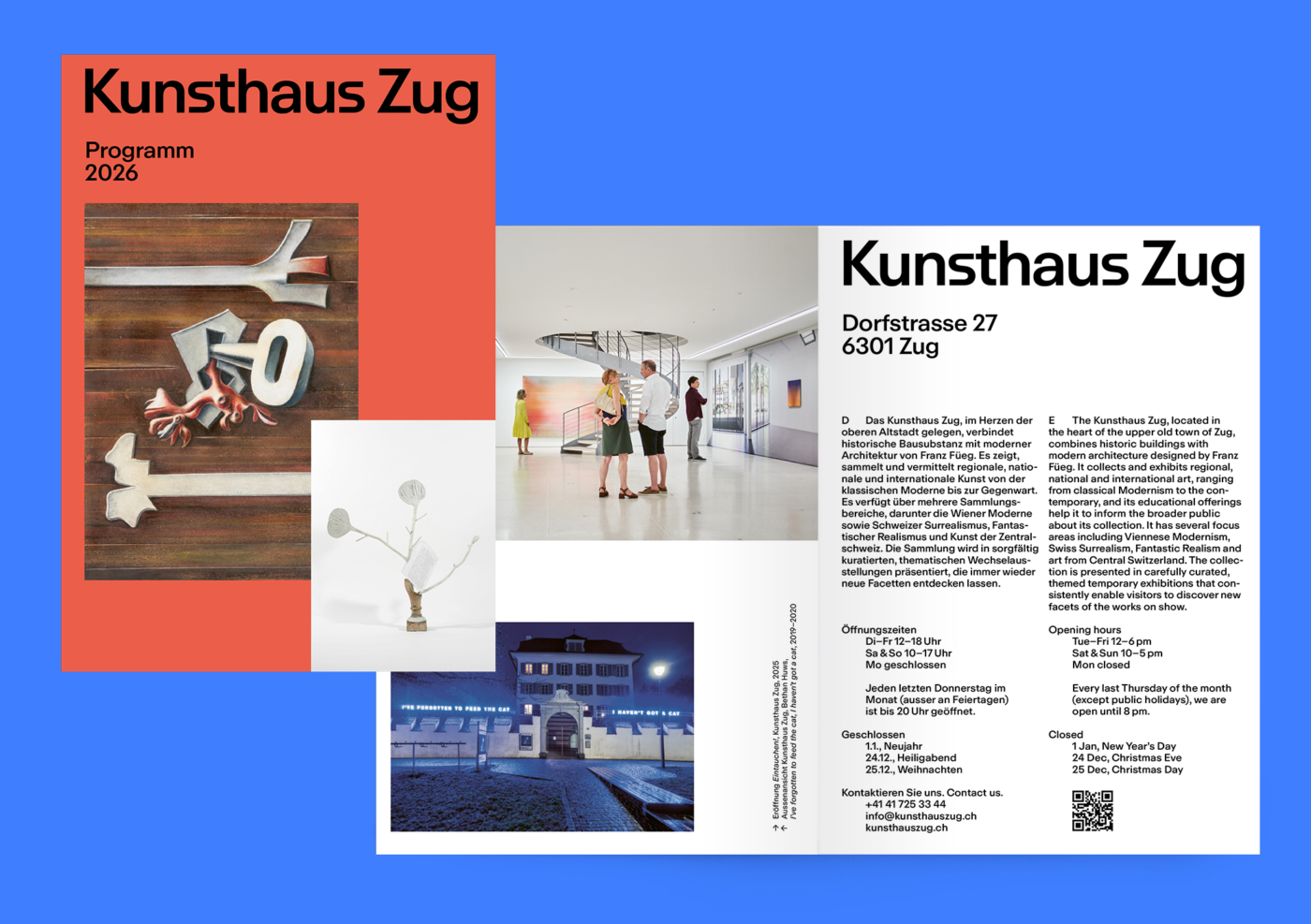 Gemeinsam mit dem Kunsthaus Zug haben wir das Erscheinungsbild weiterentwickelt und das Jahresprogramm 2026 sowie neue Ausstellungsflyer und Plakate gestaltet. Wir freuen uns sehr, diese Zusammenarbeit fortzusetzen – auch im neuen Jahr. Es wird bunt!